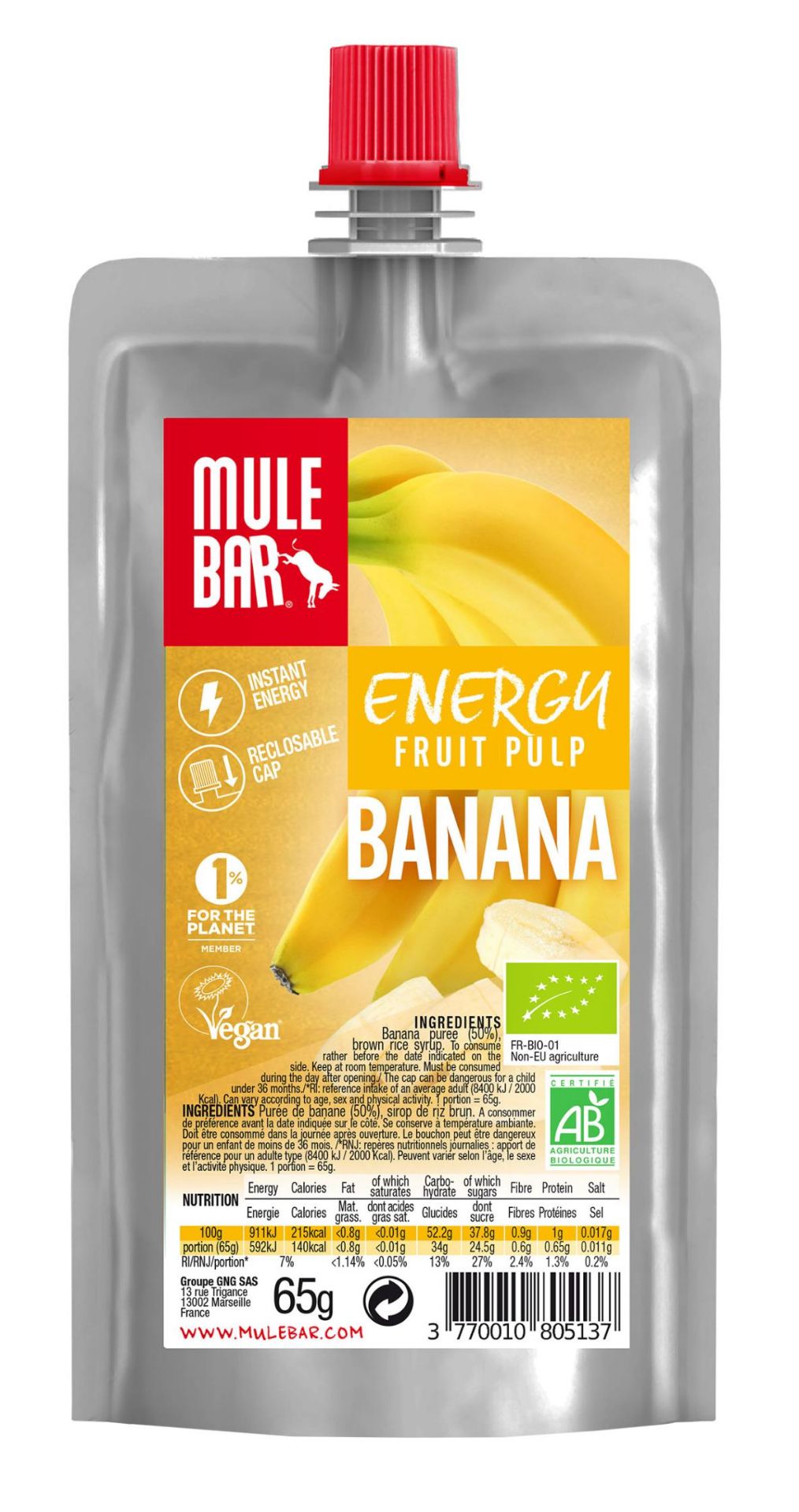 An instant energy supply in a convenient pouche : consume it in two or three times thanks to its reclosable cap and place it in the back pocket of a cycling jersey or trail running bagpack.