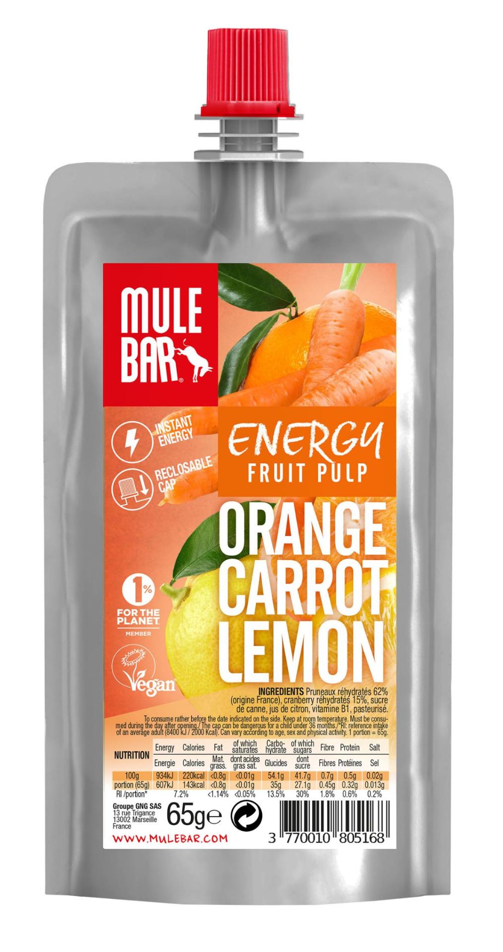 An instant energy supply in a convenient pouche : consume it in two or three times thanks to its reclosable cap and place it in the back pocket of a cycling jersey or trail running bagpack. This